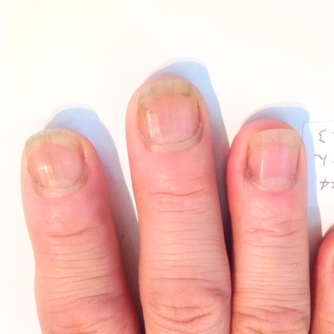 爪先がギザギザしているため、タオルやストッキングなどの繊維が引っかかって、爪が欠けやすい状態です。皮膚がめくれている部分やササクレが目立ちます。中指と薬指の爪に爪甲白斑(そうこうはくはん)と呼ばれる白い斑点があります。こ […]